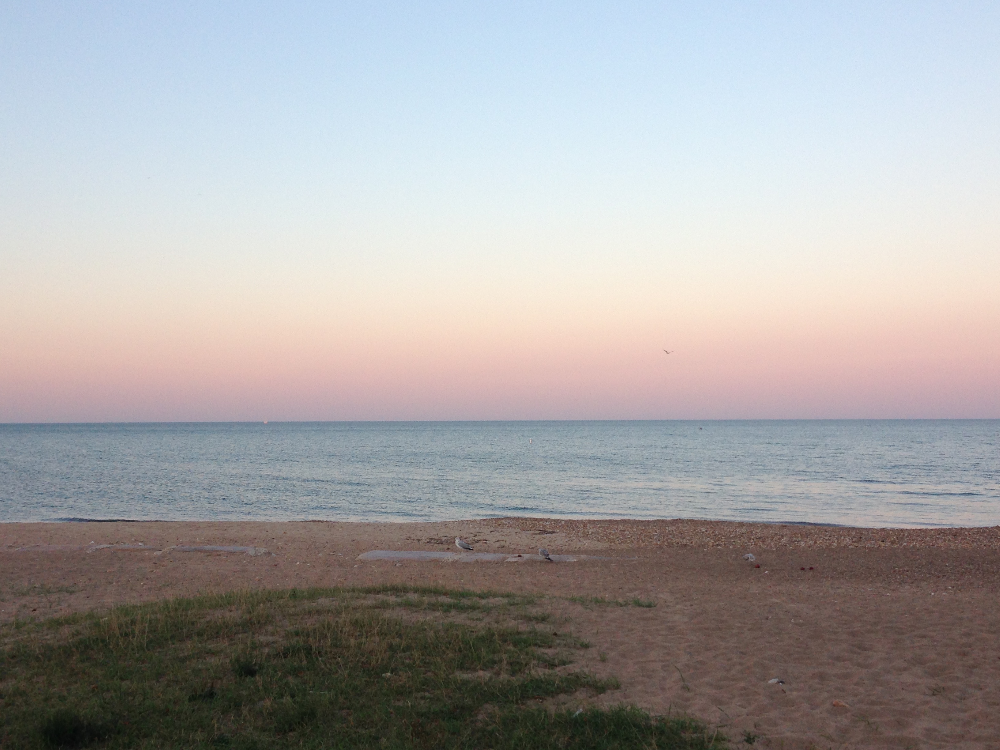 I took this picture a few weeks ago when walking on the shore of Lake Michigan at sunset. I thought the juxtaposition of the color in the sky against the blue of the water was just magnificent. Claudya sees similar sunsets every day where she lives in Heredo – she lives close to the water, further from the city center, where lone beaches like this one are common.