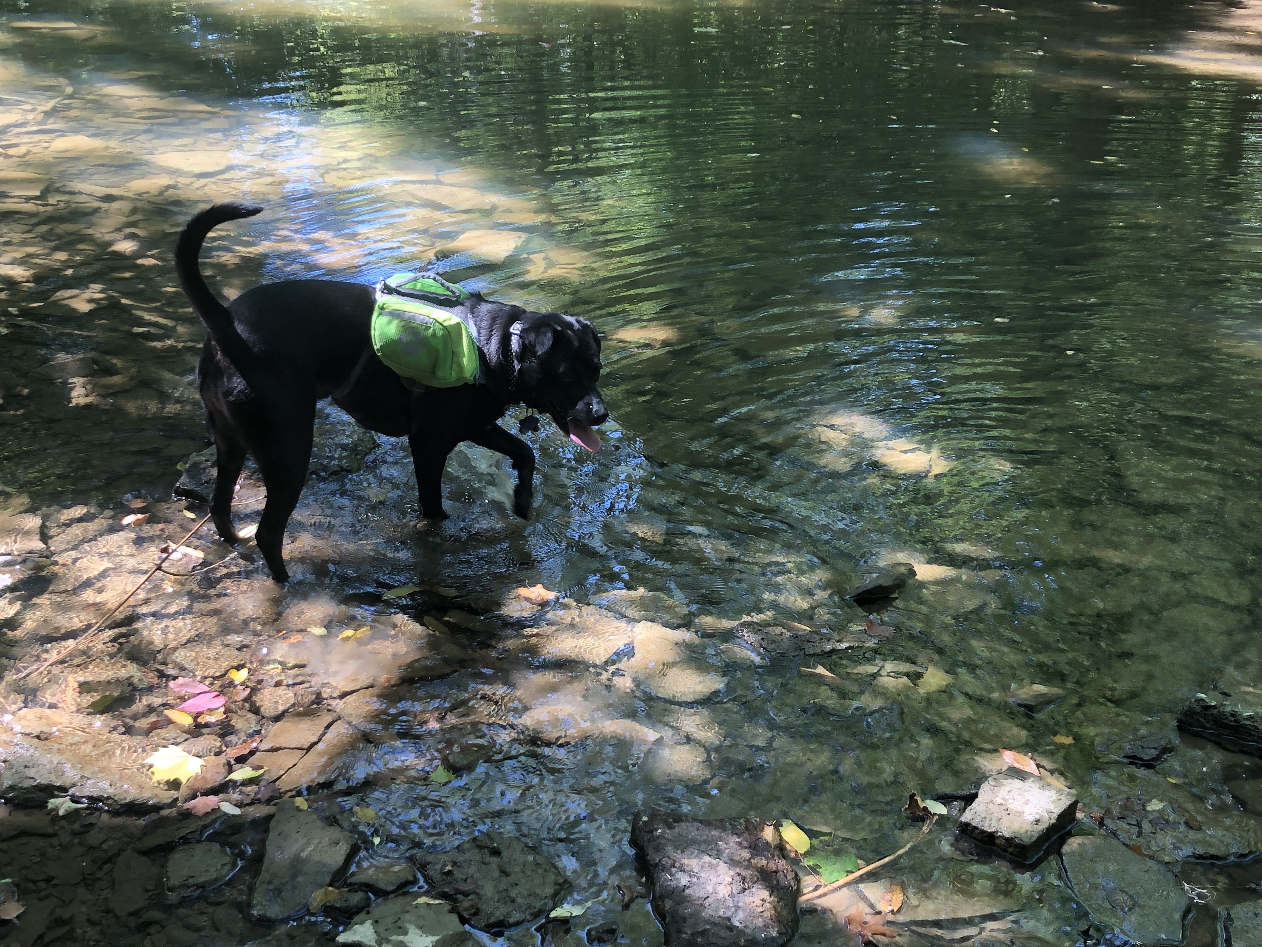 There is a beautiful park not too far from her place with several miles of hiking trails. While the parking lot looked pretty full, the trails themselves proved refreshingly isolated — no doubt thanks to the vastness of the forest. We took her Very Good Doggo, Mera, and traipsed a wandering path across several of the marked areas, including a fun splash in the creek, which Mera enjoyed immensely.