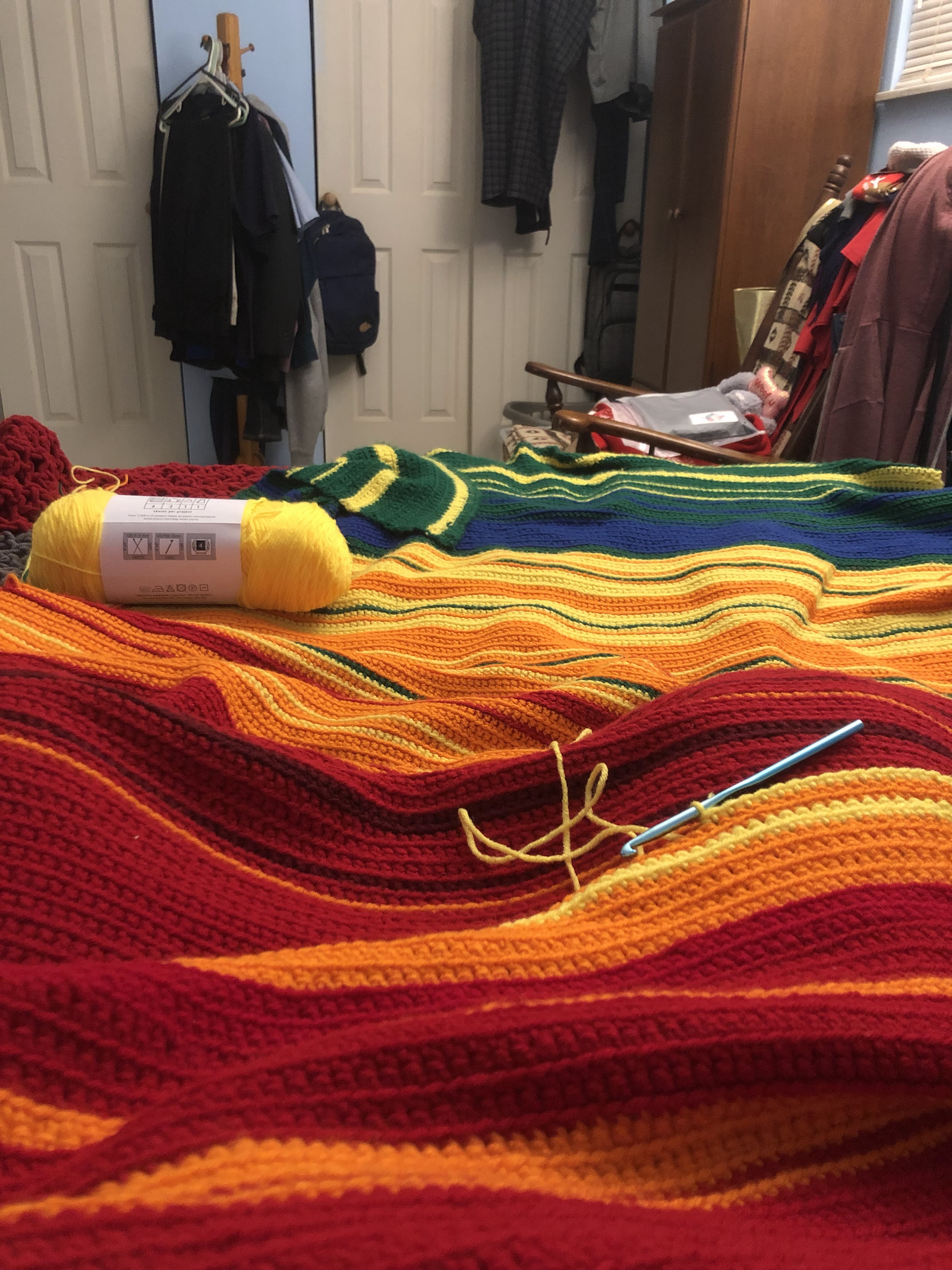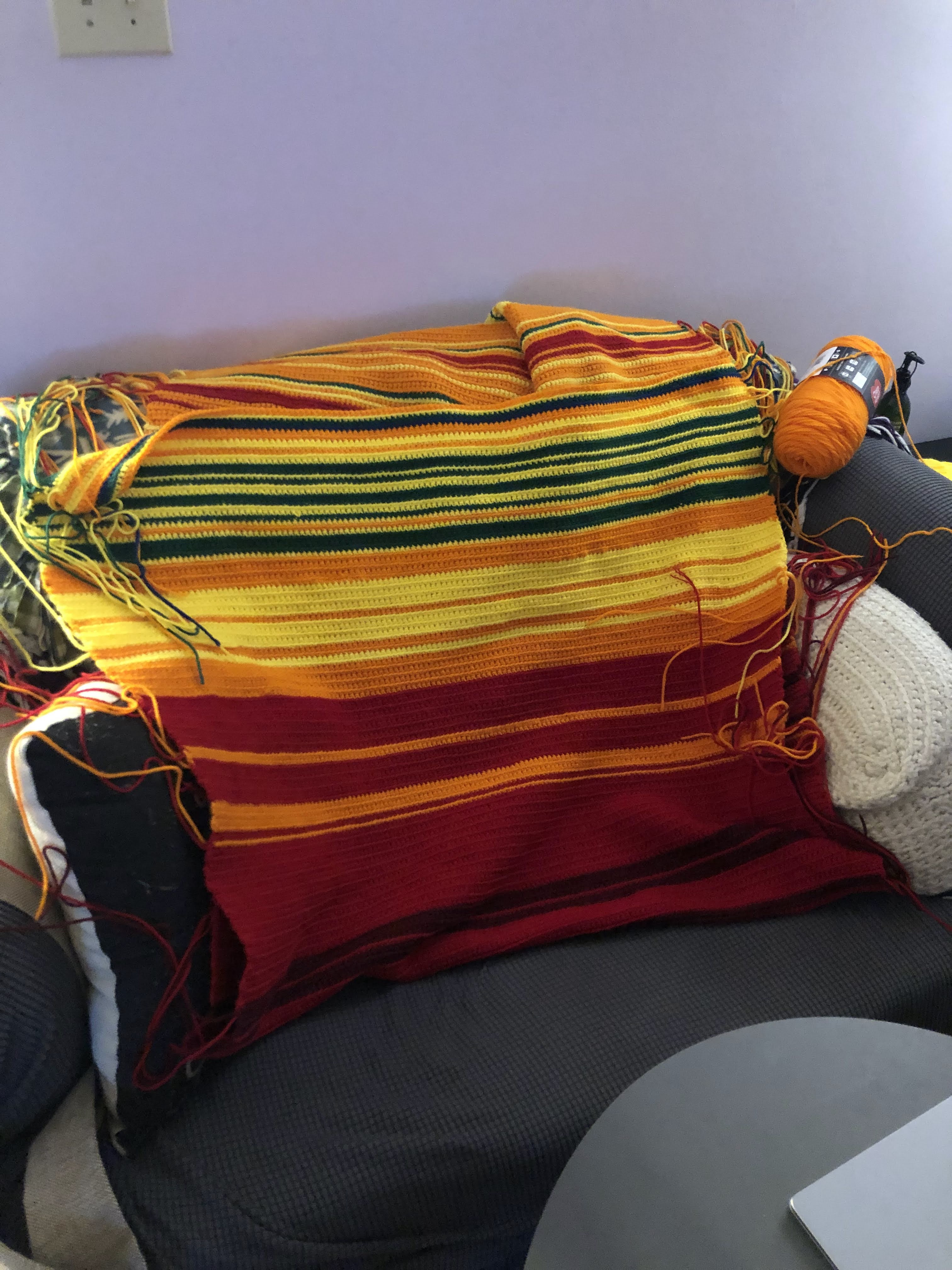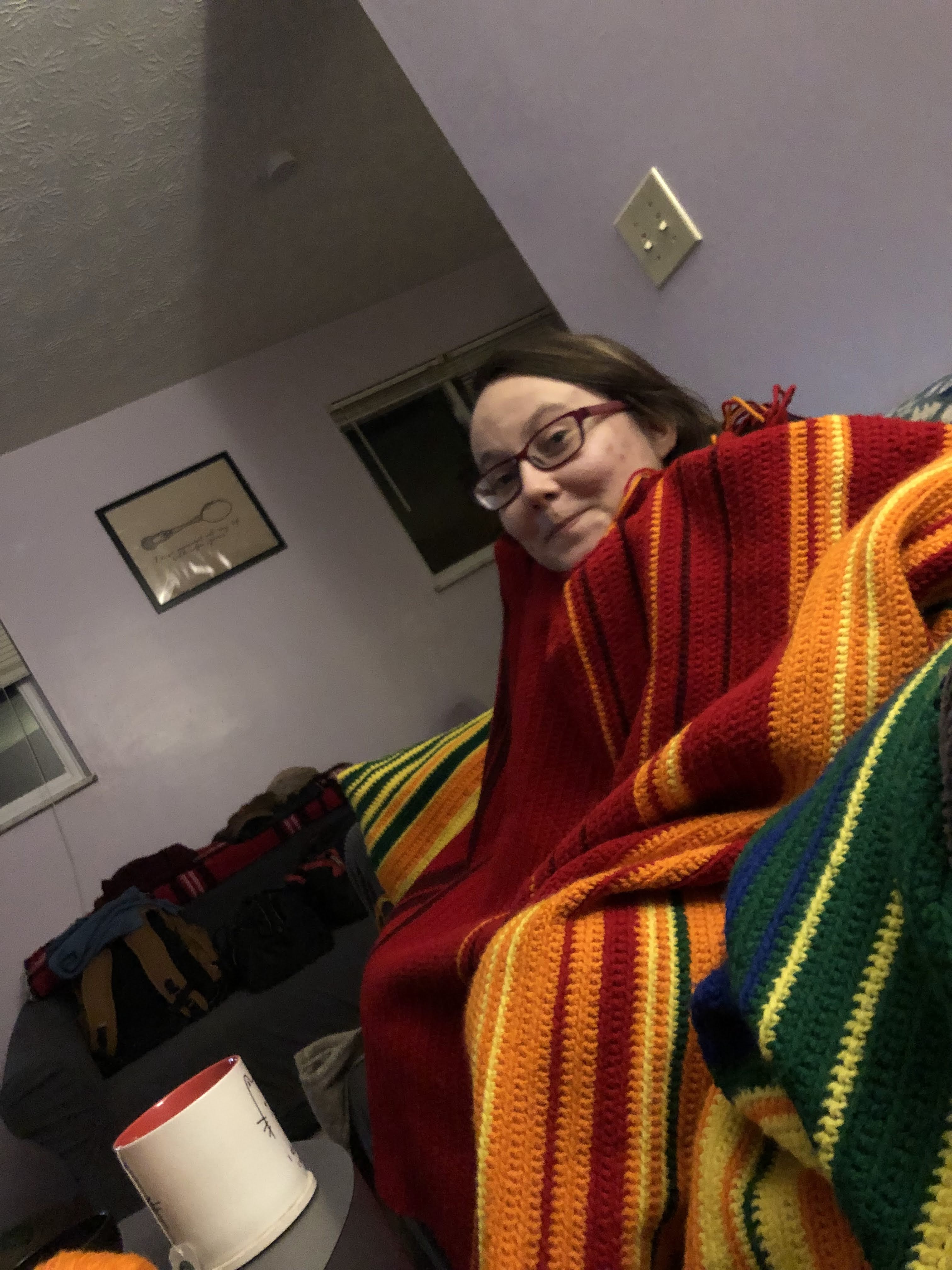 I am proud of this thing. It’s definitely not as wide as I wanted it to be, but I don’t think I’ll be using it as an actual blanket anyway. I’m going to place it as a decorative piece on the back of the couch in my living room – an artifact of 2021, the hardest year of my life.