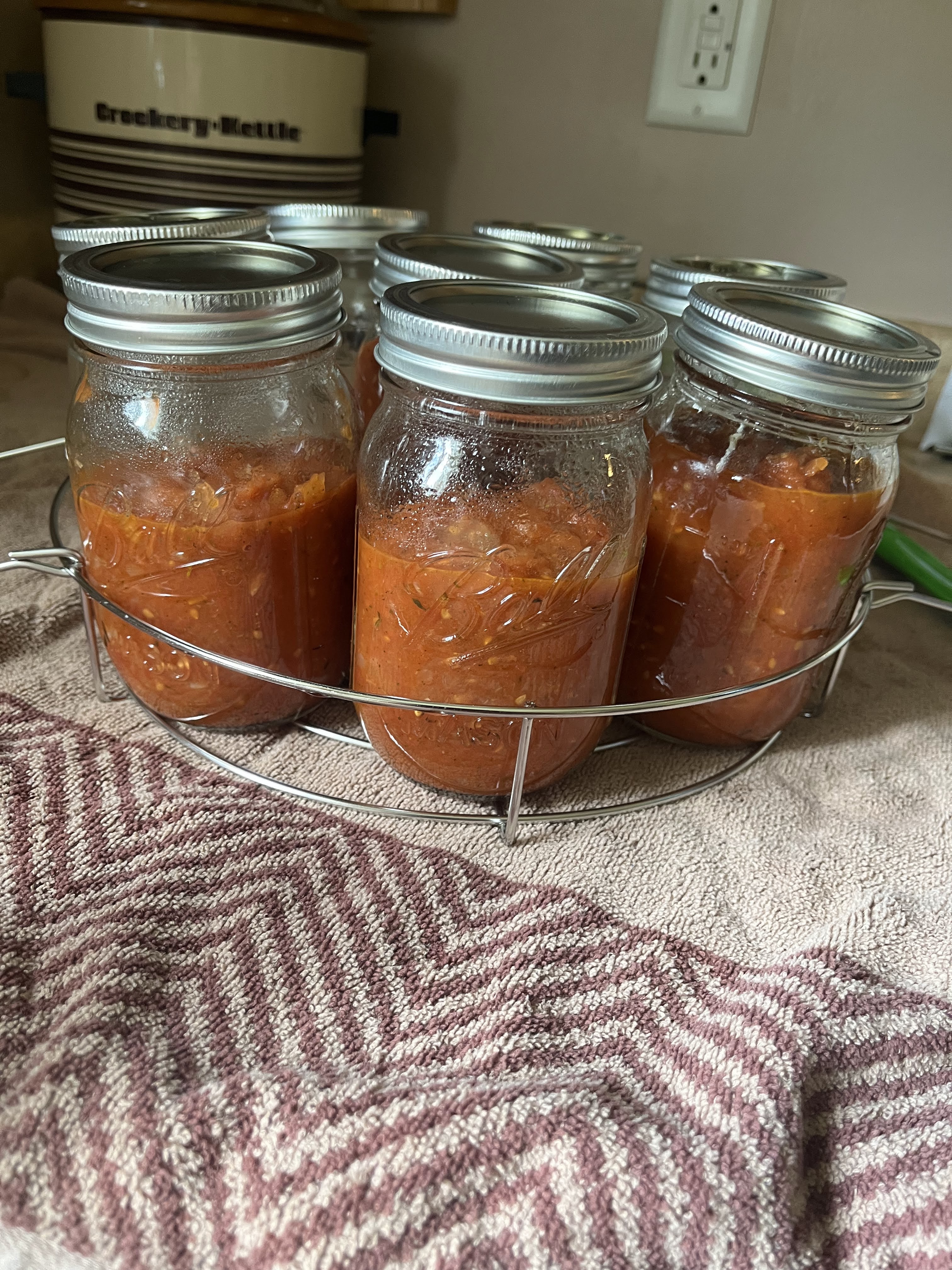 - The water has to be boiling before you put them in to seal, so it would be best to start the pot to boil while you’re cooking the sauce. The giant water bath canner takes a long time to boil.
