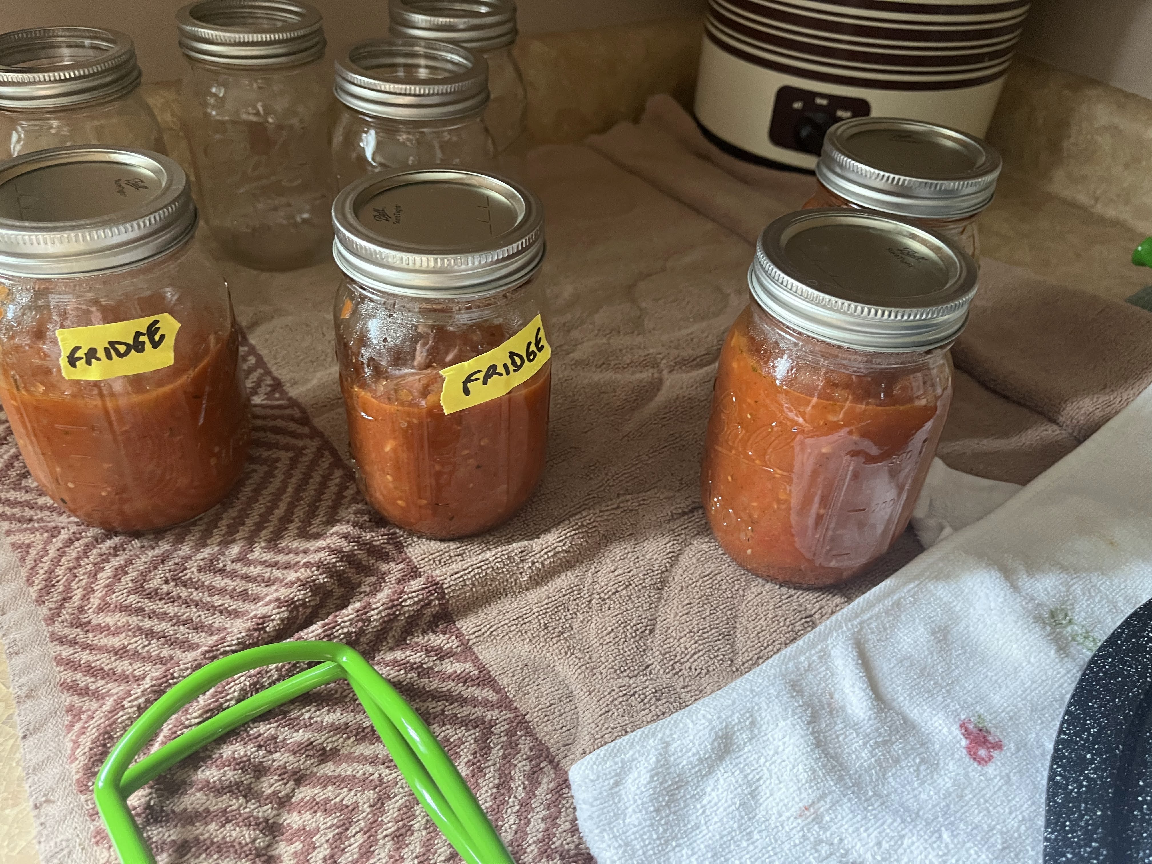 - To fill the jars all the way to the top (something canners call “leaving not a lot of headroom”) or they’ll float in the water bath (and therefore not seal). We had this issue with two of our jars. These are the ones labeled “fridge” in the photos — they’ll have to be used first.